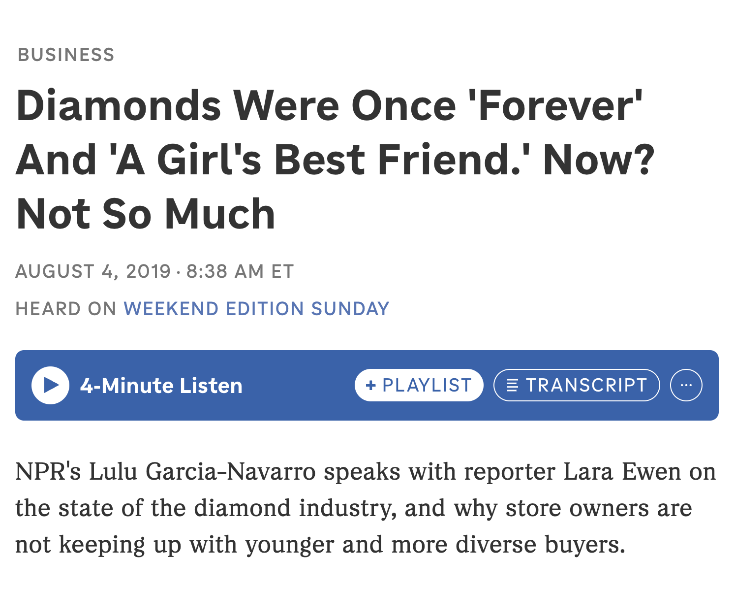It's often the biggest purchase someone will make after a car and a home. But these days, people ain't buying it - for real. There is a crisis in the diamond industry with sales nosediving. And here to explain why is Lara Ewen. She's covered the diamond industry for a long time. Welcome.